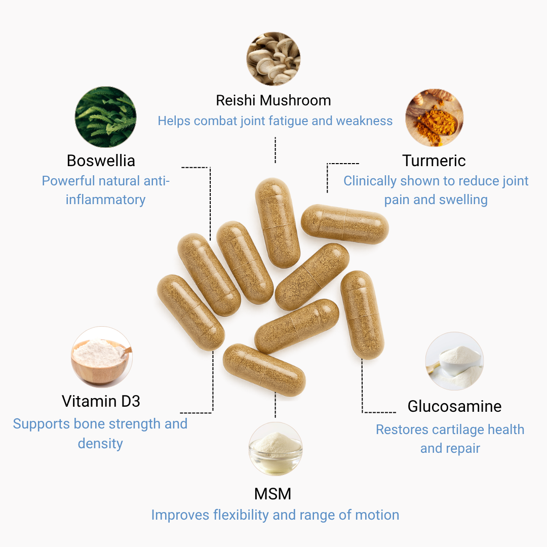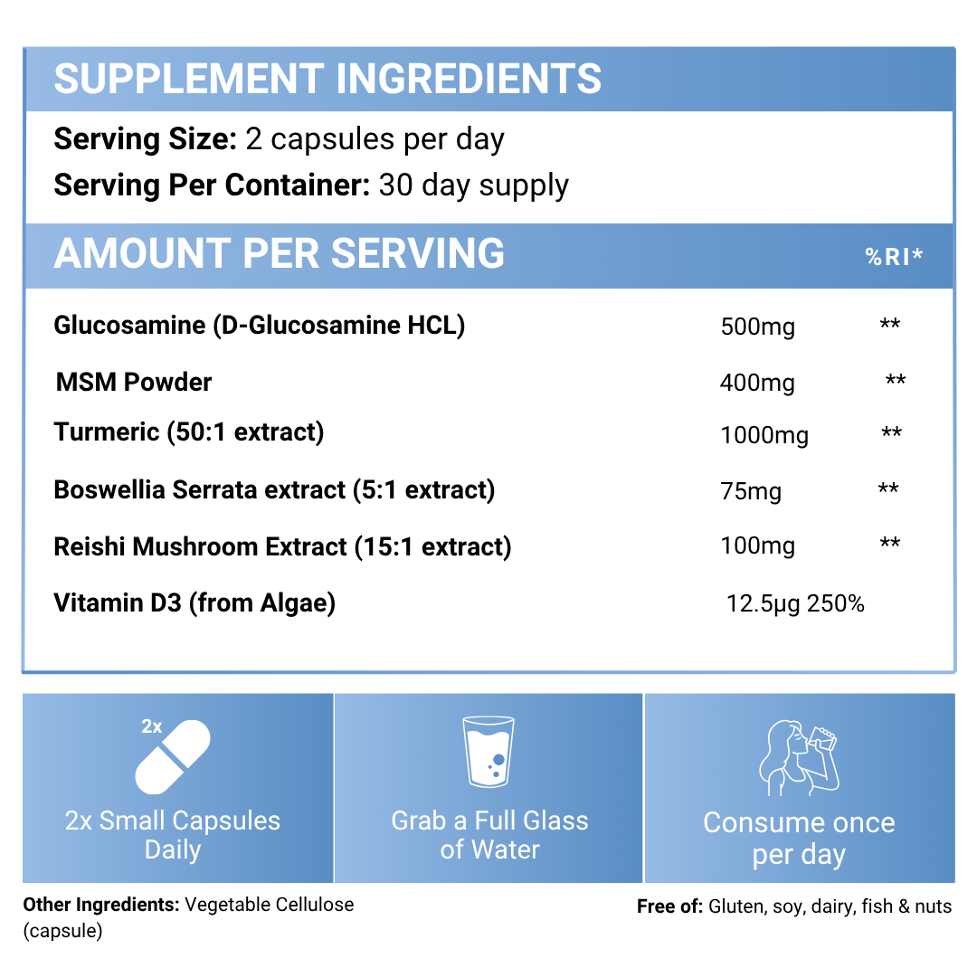 Glucosamine (D-Glucosamine HCL), MSM Powder, Turmeric, Boswellia Serrata, Reishi Mushroom, Vitamin D3