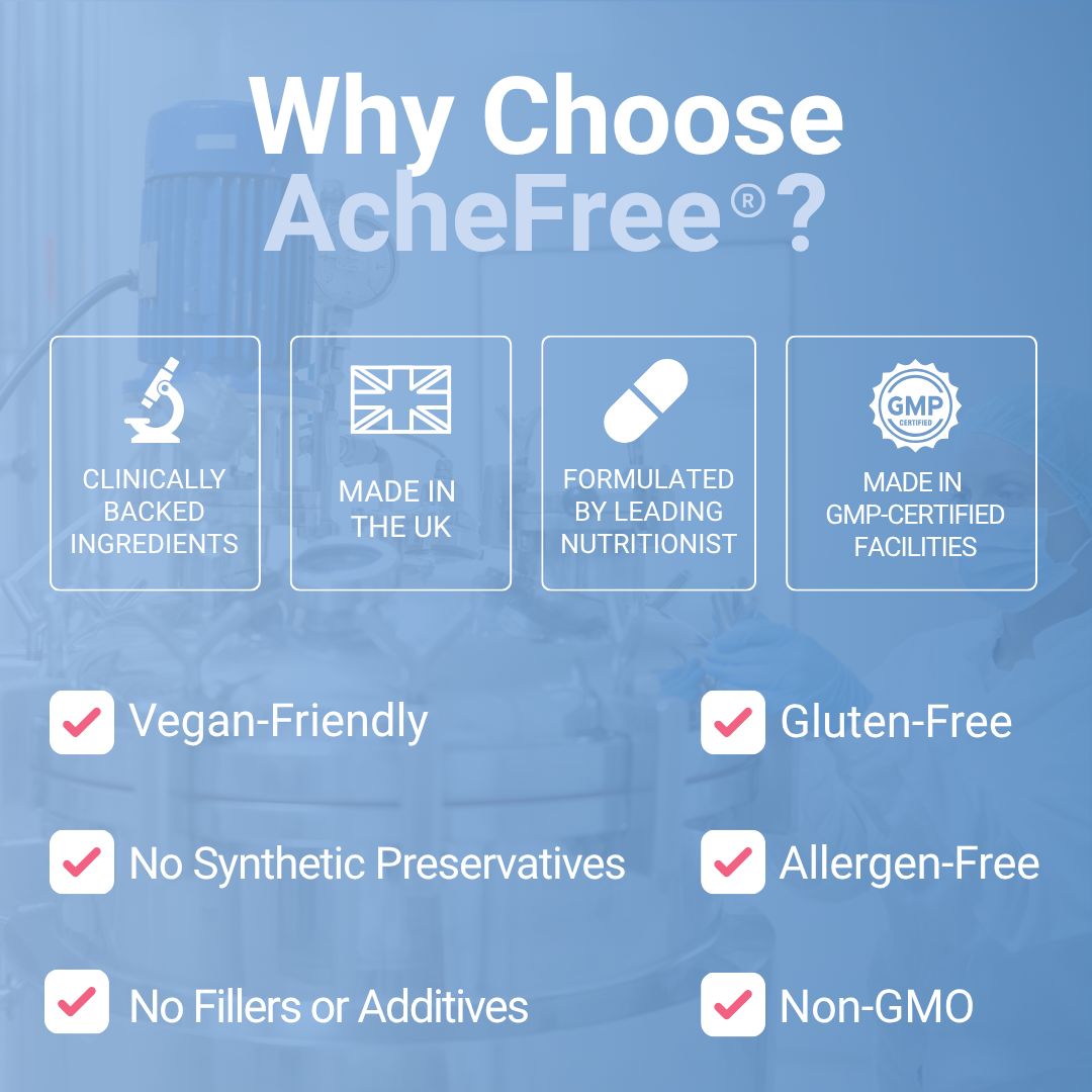 Neuaura’s Ache-Free Supplement is a food supplement. Food supplements are not a replacement for a varied and balanced diet and a healthy lifestyle. Information provided on this site is for general informational purposes only and should not be considered a substitute for professional medical advice. Always consult a healthcare professional before making any changes to your diet, lifestyle, or supplement routine. This statement has not been evaluated by the Food Standards Agency (FSA) or the Medicines and Healthcare products Regulatory Agency (MHRA). This product is not intended to diagnose, treat, cure, or prevent any disease. This product is not suitable for individuals under 18 years old, those who are pregnant, trying to conceive, or breastfeeding. AcheFree Supplement has not been studied in combination with prescription medications or other supplements; if you have any concerns about potential interactions, please consult a healthcare professional before use. If you have any pre-existing health conditions, seek medical advice before taking AcheFree Supplement.