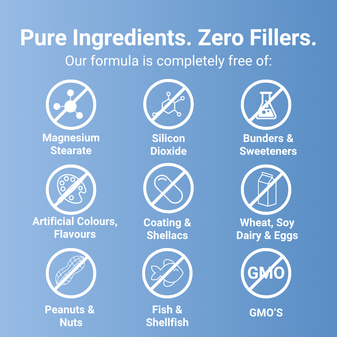 No bulkers, fillers, coatings, dyes, GMOs, gluten, dairy or heavy metals