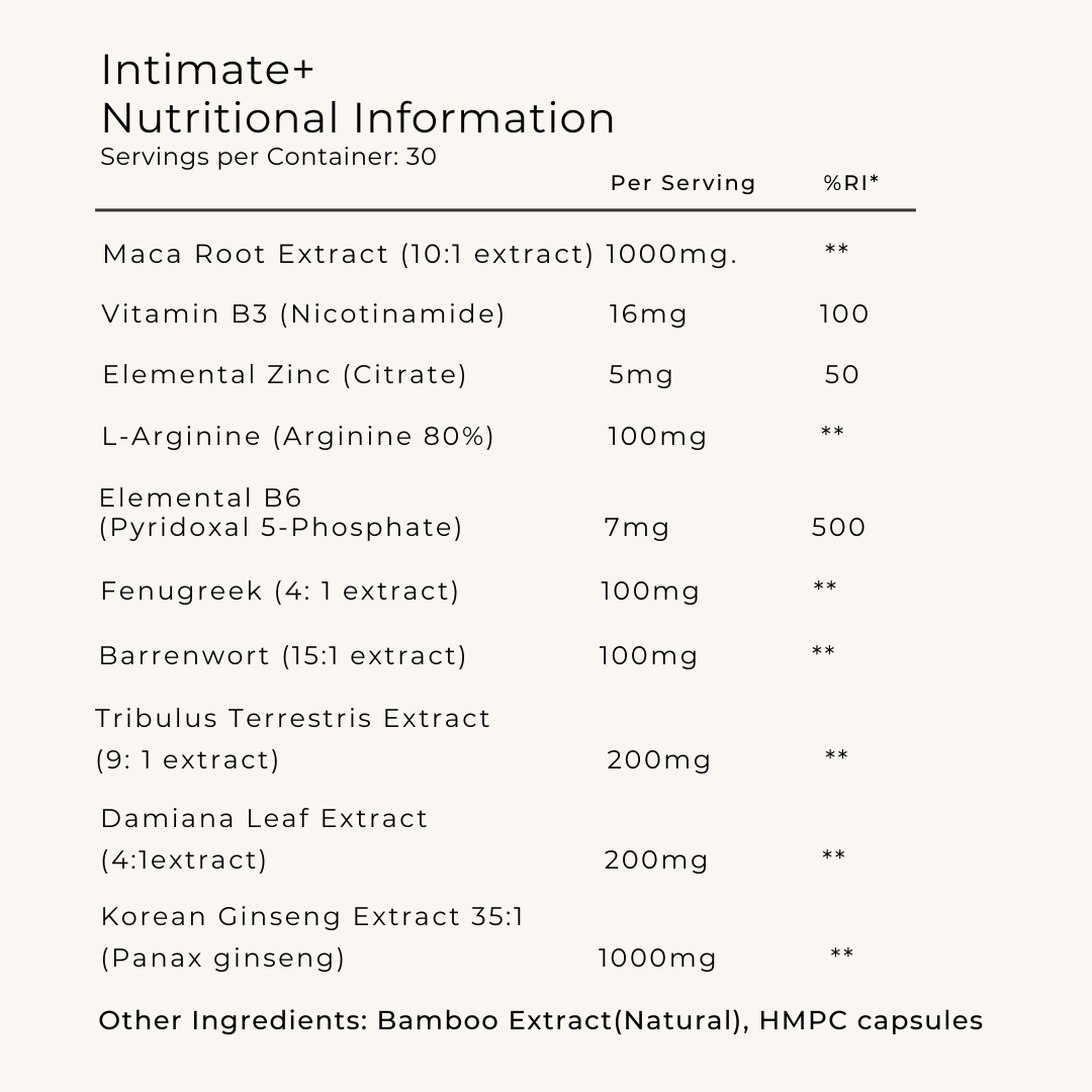 Formulated with natural botanicals like Maca, Ginseng, and Fenugreek, Intimate+ supports everyday balance, vitality, and connection. It’s designed to help you feel more in tune with your body and more confident in your own skin — so you can bring your spark back, naturally.